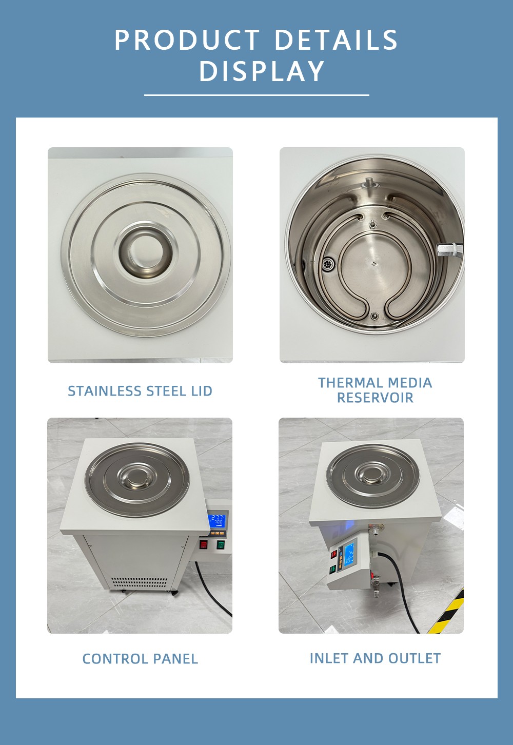 This equipment is heat conducting medium driven by circulating pump and passes through electric heating tank for heat exchange to reach the required temperature. Closed pipeline design, reduce the demand for heat conduction fluid at the same time, improve the heat utilization of the system, to achieve the effect of rapid warming. It is used for supporting other instruments and equipments that need to provide heat source, and is the ideal production equipment for modern fine chemistry, biopharmaceuticals, and synthetic new materials.