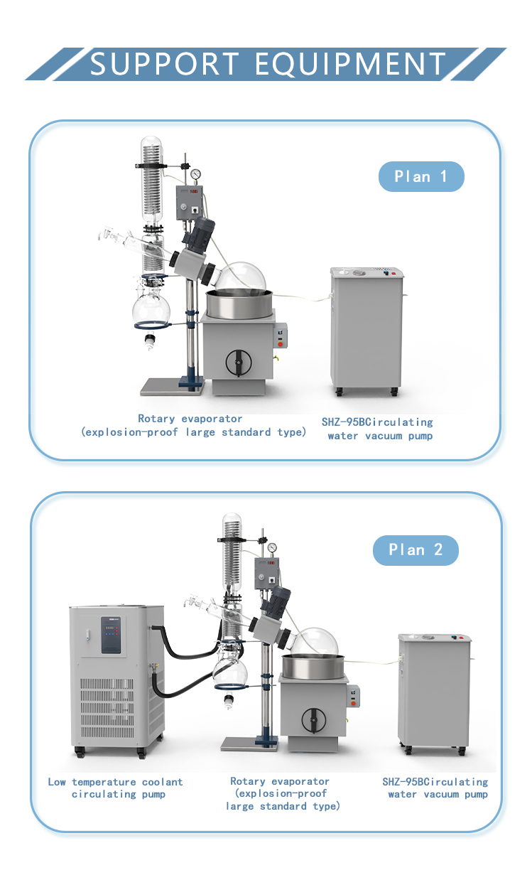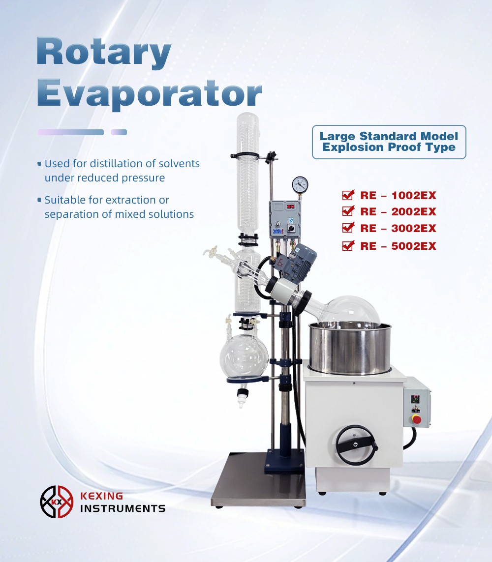 Rotary evaporator is mainly used for continuous distillation of large amount of volatile solvents under reduced pressure. It is suitable for extracting solvents or separating mixed solutions, and can be used in the following experiments or product production: ① solution concentration; ② solvent recovery; ③ chemical separation; ④ essential oil extraction; ⑤ removing solvents from samples. Especially for the concentration and crystallization of extracts and the distillation of receiving solution in chromatographic separation. The basic principle of rotary evaporator is vacuum distillation, i.e., under the condition of reduced pressure, the glass bottle with reaction materials is rotated at constant speed and heated uniformly at constant temperature, the boiling point of materials is lowered, the liquid forms a film and evaporates, and then the solvents are recovered through the glass coiled condenser and collector. It is the ideal equipment for experiments and production in the fields of pharmacy, chemical industry, foodstuff, material and so on.