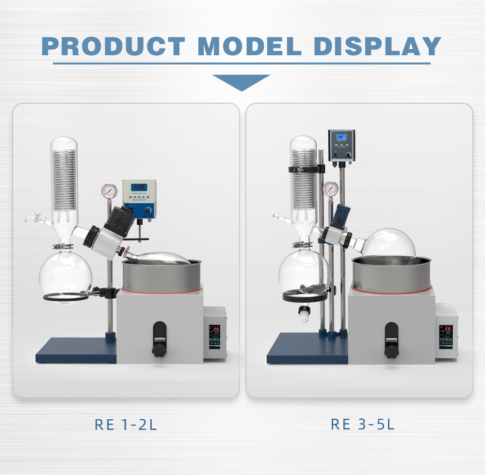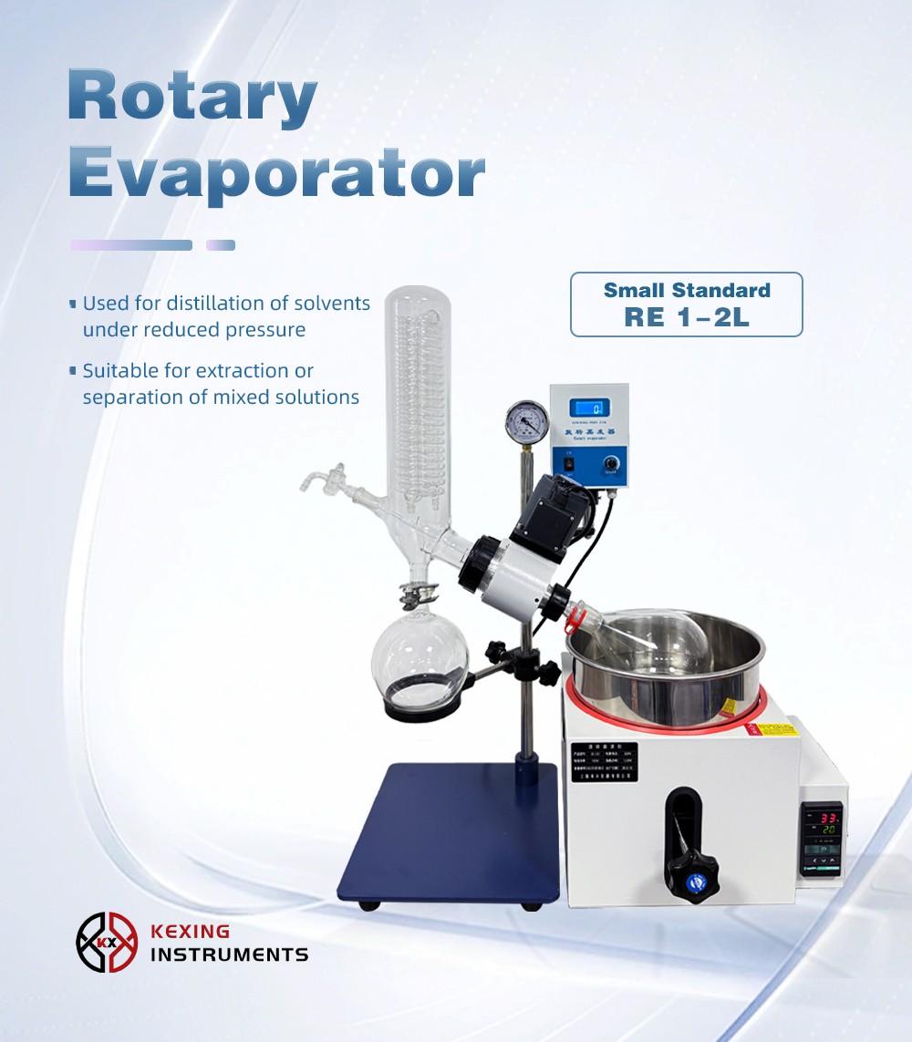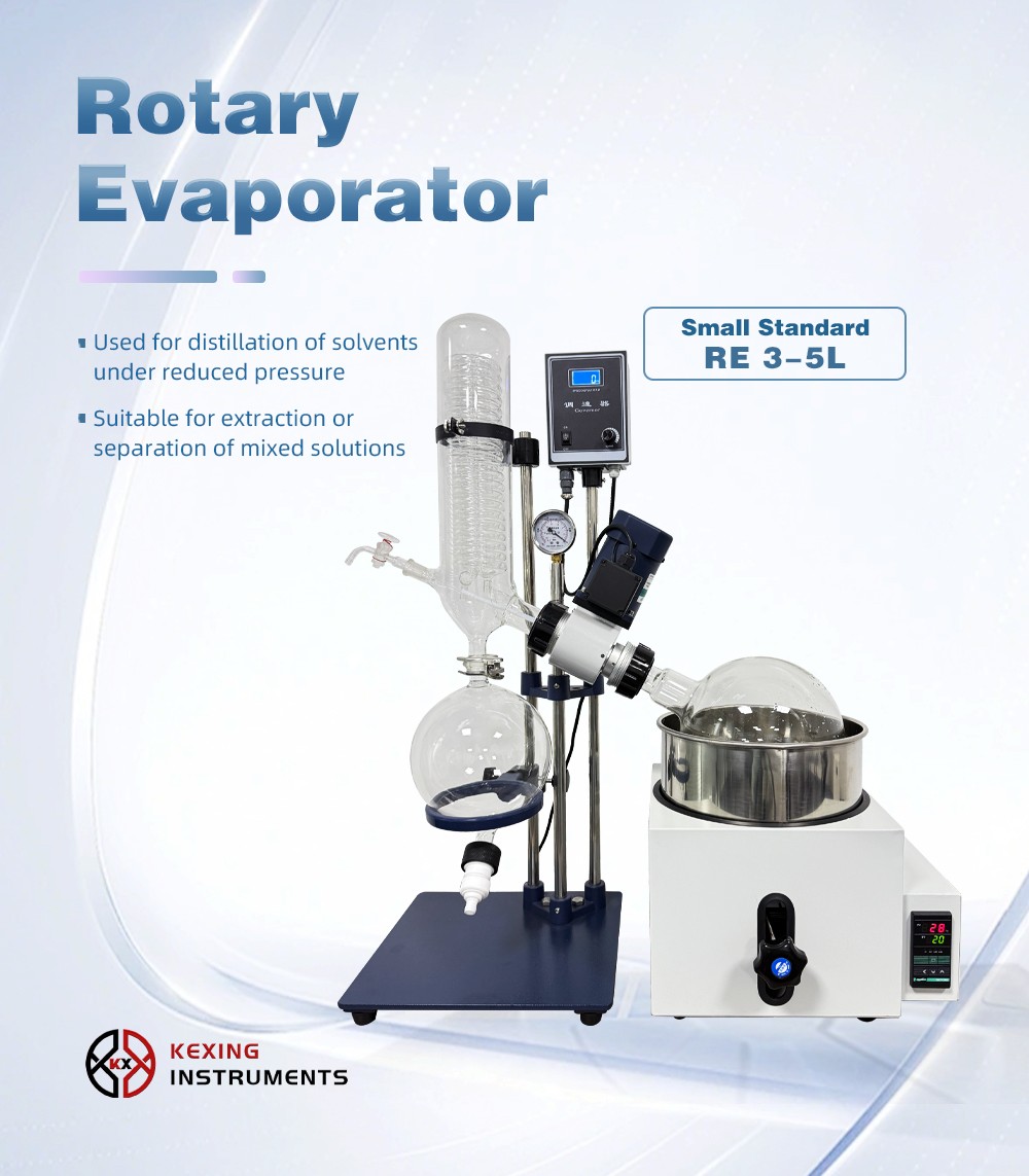 Rotary evaporator is mainly used for continuous distillation of large amount of volatile solvents under reduced pressure. It is suitable for extracting solvents or separating mixed solutions, and can be used in the following experiments or product production: ① solution concentration; ② solvent recovery; ③ chemical separation; ④ essential oil extraction; ⑤ removing solvents from samples. Especially for the concentration and crystallization of extracts and the distillation of receiving solution in chromatographic separation. The basic principle of rotary evaporator is vacuum distillation, i.e., under the condition of reduced pressure, the glass bottle with reaction materials is rotated at constant speed and heated uniformly at constant temperature, the boiling point of materials is lowered, the liquid forms a film and evaporates, and then the solvents are recovered through the glass coiled condenser and collector. It is the ideal equipment for experiments and production in the fields of pharmacy, chemical industry, foodstuff, material and so on.
