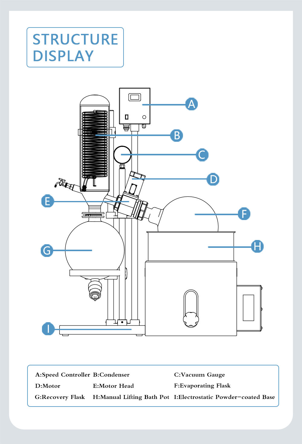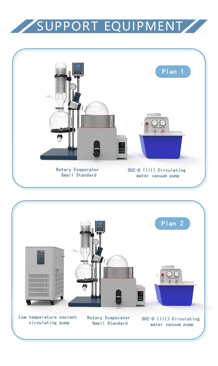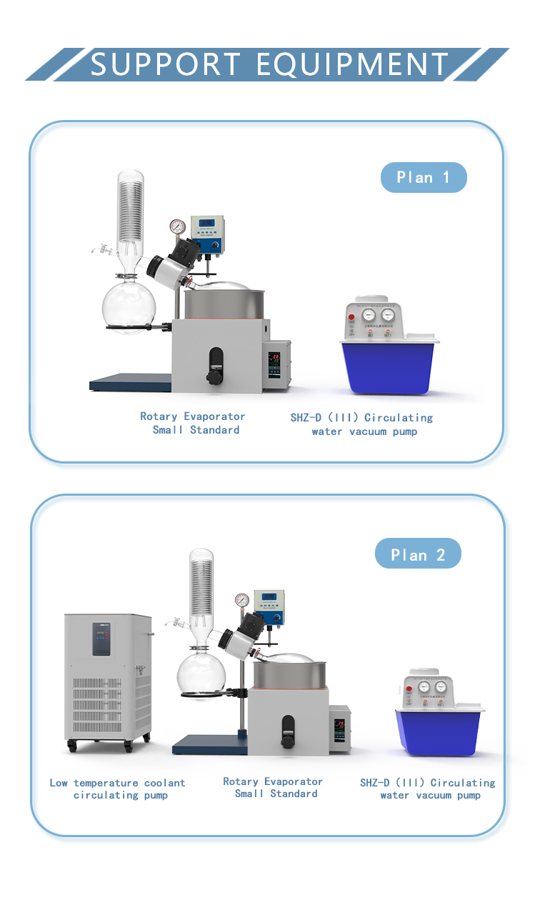 Rotary evaporator is mainly used for continuous distillation of large amount of volatile solvents under reduced pressure. It is suitable for extracting solvents or separating mixed solutions, and can be used in the following experiments or product production: ① solution concentration; ② solvent recovery; ③ chemical separation; ④ essential oil extraction; ⑤ removing solvents from samples. Especially for the concentration and crystallization of extracts and the distillation of receiving solution in chromatographic separation. The basic principle of rotary evaporator is vacuum distillation, i.e., under the condition of reduced pressure, the glass bottle with reaction materials is rotated at constant speed and heated uniformly at constant temperature, the boiling point of materials is lowered, the liquid forms a film and evaporates, and then the solvents are recovered through the glass coiled condenser and collector. It is the ideal equipment for experiments and production in the fields of pharmacy, chemical industry, foodstuff, material and so on.