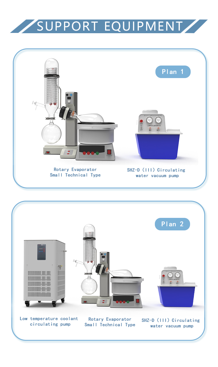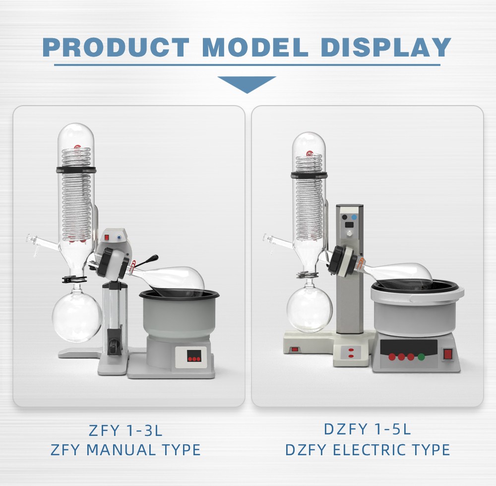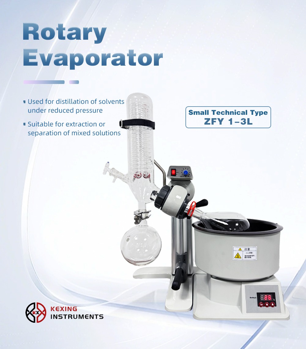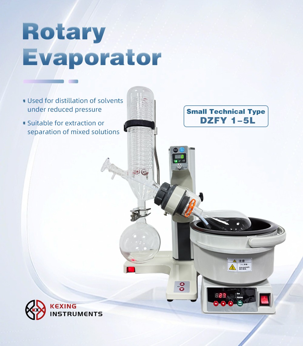Rotary evaporator is mainly used for continuous distillation of large amount of volatile solvents under reduced pressure. It is suitable for extracting solvents or separating mixed solutions, and can be used in the following experiments or product production: ① solution concentration; ② solvent recovery; ③ chemical separation; ④ essential oil extraction; ⑤ removing solvents from samples. Especially for the concentration and crystallization of extracts and the distillation of receiving solution in chromatographic separation. The basic principle of rotary evaporator is vacuum distillation, i.e., under the condition of reduced pressure, the glass bottle with reaction materials is rotated at constant speed and heated uniformly at constant temperature, the boiling point of materials is lowered, the liquid forms a film and evaporates, and then the solvents are recovered through the glass coiled condenser and collector. It is the ideal equipment for experiments and production in the fields of pharmacy, chemical industry, foodstuff, material and so on.