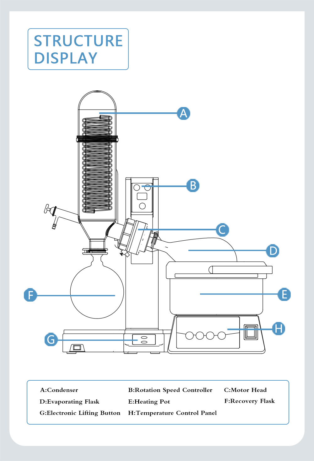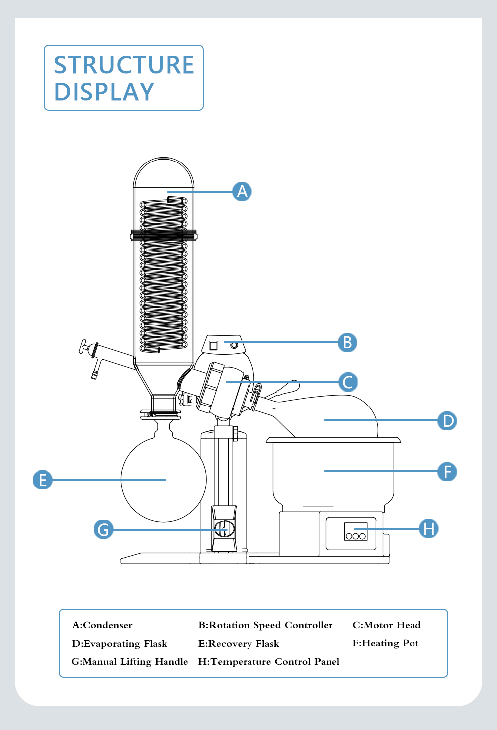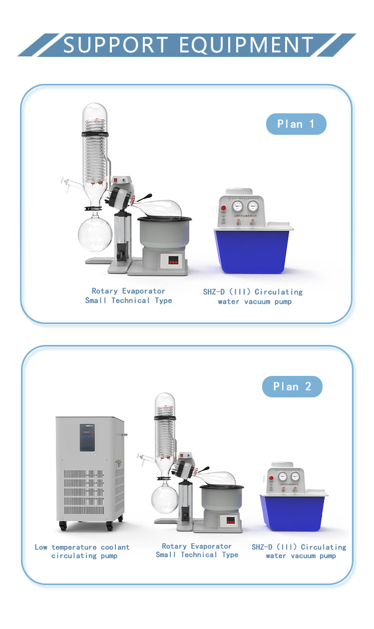 Rotary evaporator is mainly used for continuous distillation of large amount of volatile solvents under reduced pressure. It is suitable for extracting solvents or separating mixed solutions, and can be used in the following experiments or product production: ① solution concentration; ② solvent recovery; ③ chemical separation; ④ essential oil extraction; ⑤ removing solvents from samples. Especially for the concentration and crystallization of extracts and the distillation of receiving solution in chromatographic separation. The basic principle of rotary evaporator is vacuum distillation, i.e., under the condition of reduced pressure, the glass bottle with reaction materials is rotated at constant speed and heated uniformly at constant temperature, the boiling point of materials is lowered, the liquid forms a film and evaporates, and then the solvents are recovered through the glass coiled condenser and collector. It is the ideal equipment for experiments and production in the fields of pharmacy, chemical industry, foodstuff, material and so on.