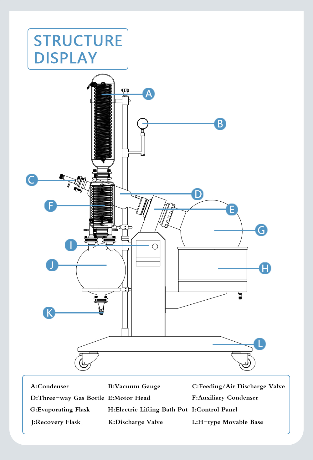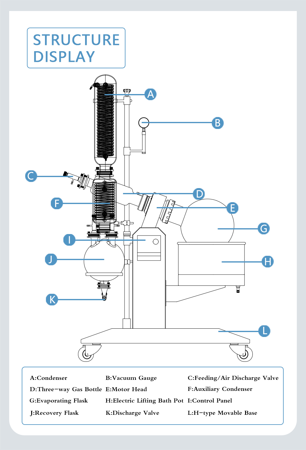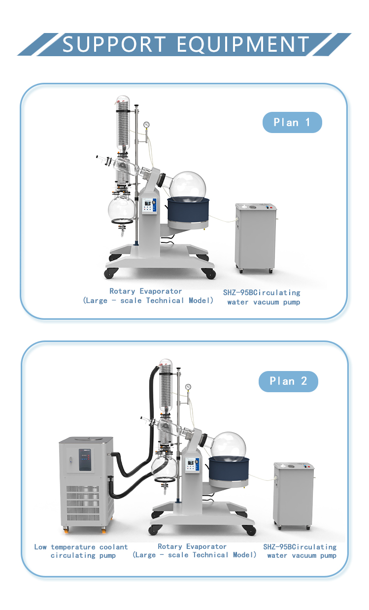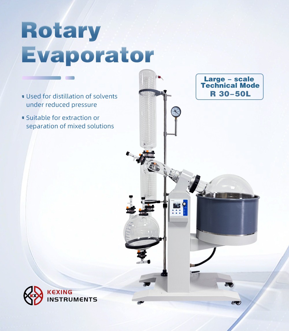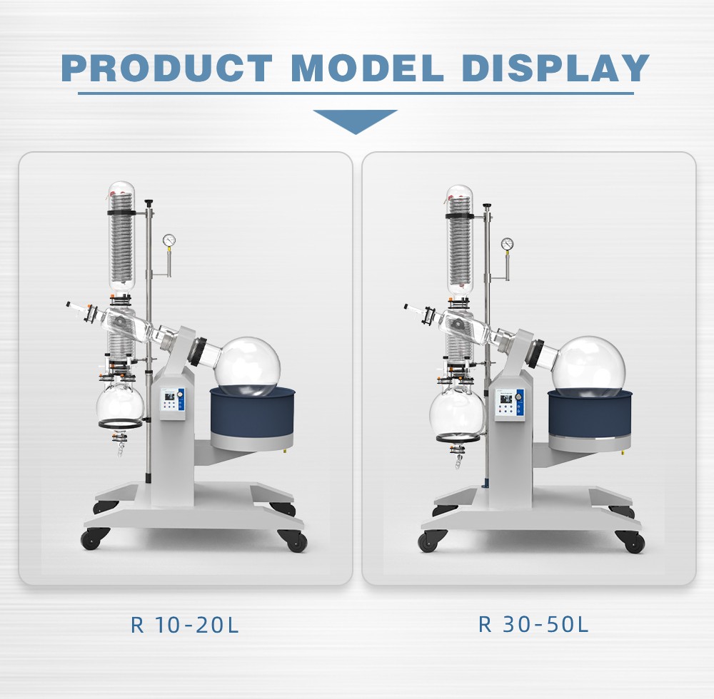 Rotary evaporator is mainly used for continuous distillation of large amount of volatile solvents under reduced pressure. It is suitable for extracting solvents or separating mixed solutions, and can be used in the following experiments or product production: ① solution concentration; ② solvent recovery; ③ chemical separation; ④ essential oil extraction; ⑤ removing solvents from samples. Especially for the concentration and crystallization of extracts and the distillation of receiving solution in chromatographic separation. The basic principle of rotary evaporator is vacuum distillation, i.e., under the condition of reduced pressure, the glass bottle with reaction materials is rotated at constant speed and heated uniformly at constant temperature, the boiling point of materials is lowered, the liquid forms a film and evaporates, and then the solvents are recovered through the glass coiled condenser and collector. It is the ideal equipment for experiments and production in the fields of pharmacy, chemical industry, foodstuff, material and so on.